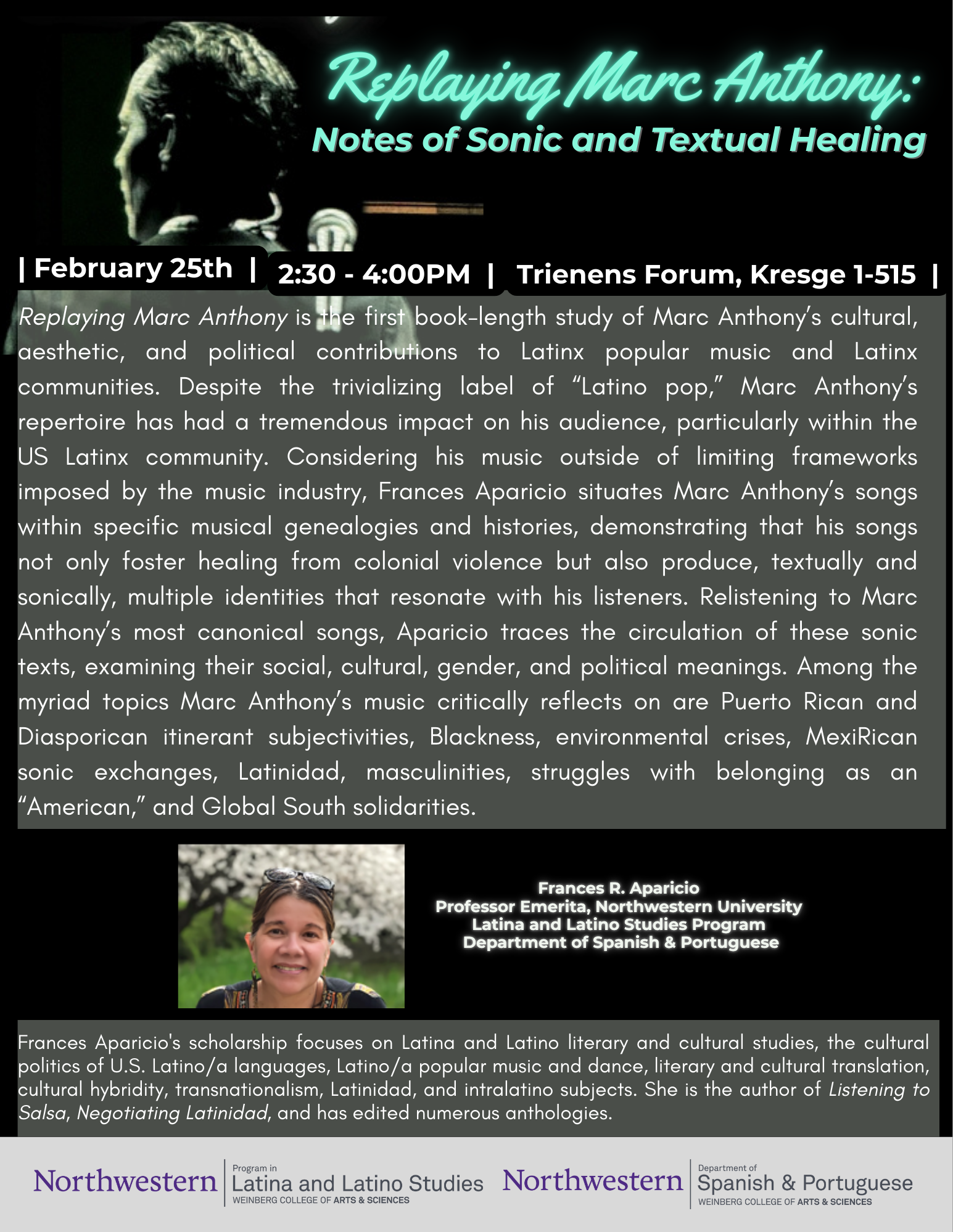 Join us welcoming Professor Emerita, Dr. Frances R. Aparicio back on campus for a celebration of her latest book! Replaying Marc Anthon...
