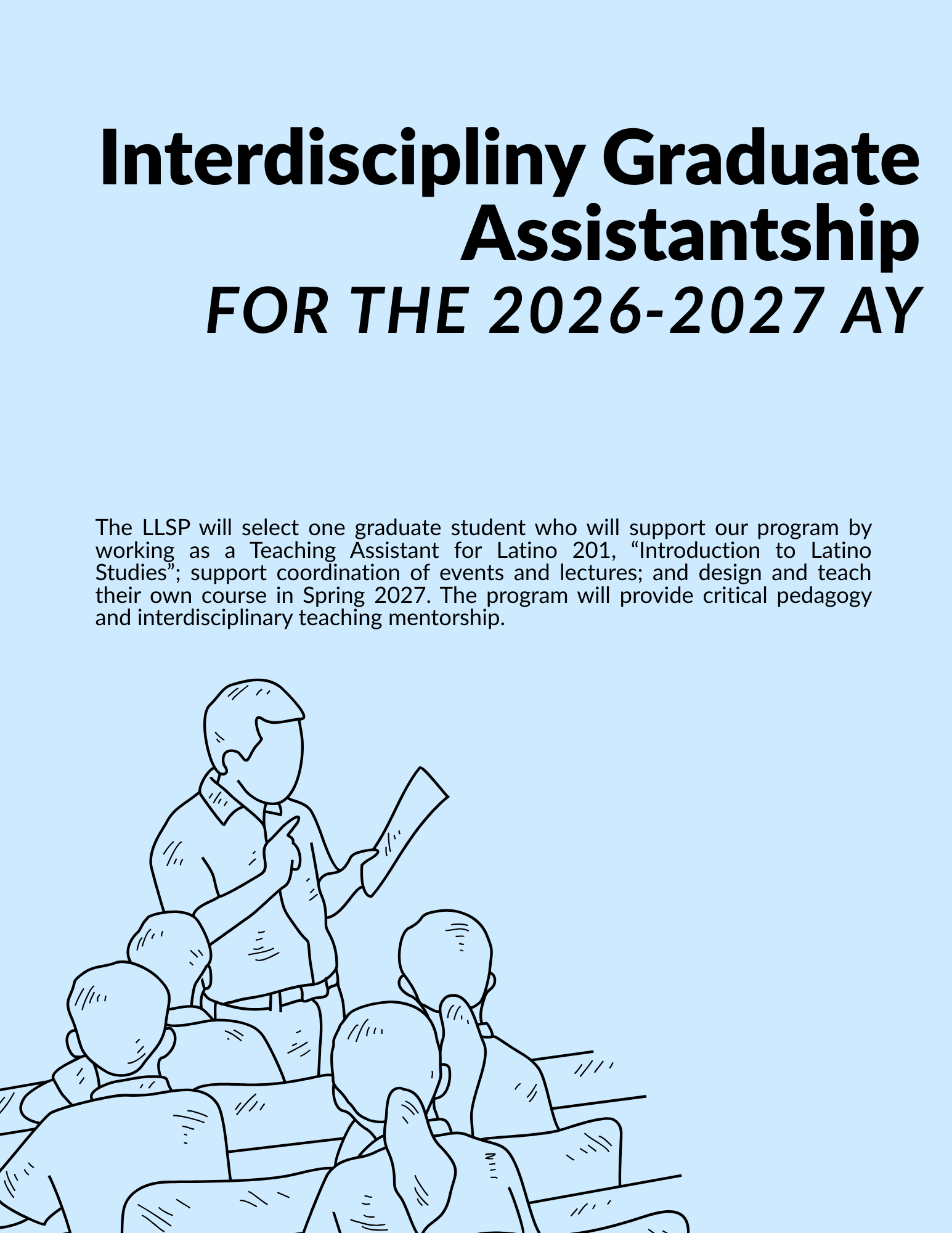 The LLSP will select one graduate student who will support our program by working as a Teaching Assistant for Latino 201, “Introduction to Latino Studies”; support coordination of events and lectures; and design and teach their own course in Spring 2027. The program will provide critical pedagogy and interdisciplinary teaching mentorship.